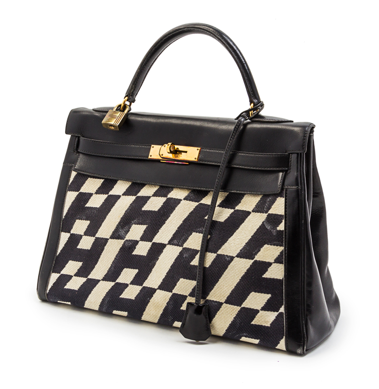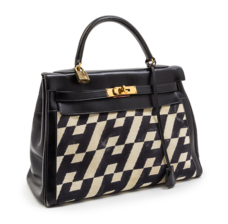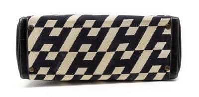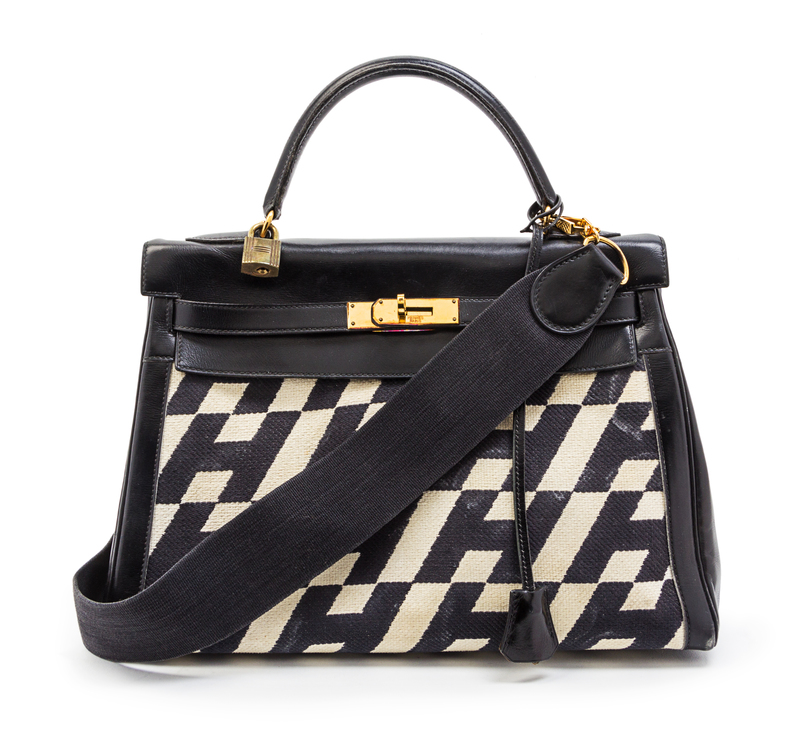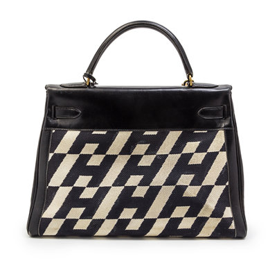 A Rare Hermes 35cm Ulysses Black Leather and Ivory Canvas Kelly Bag,