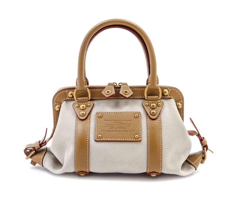 brass hardware, two top handles, framed top with zippered top closure, interior slip pocket, striped cotton lining. Stamped: Louis Vuitton.