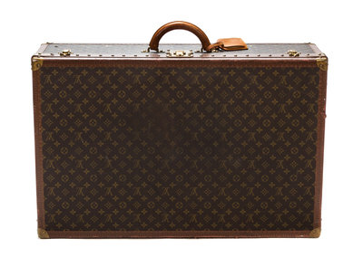 leather trim, interior tray with linen straps, brass fittings and hardware with detachable luggage tag. Stamped: Louis Vuitton.