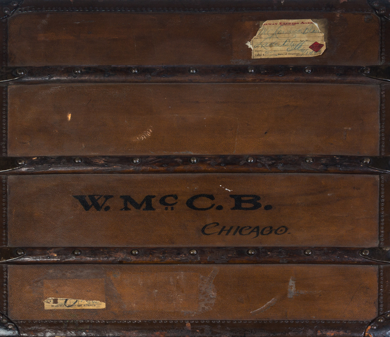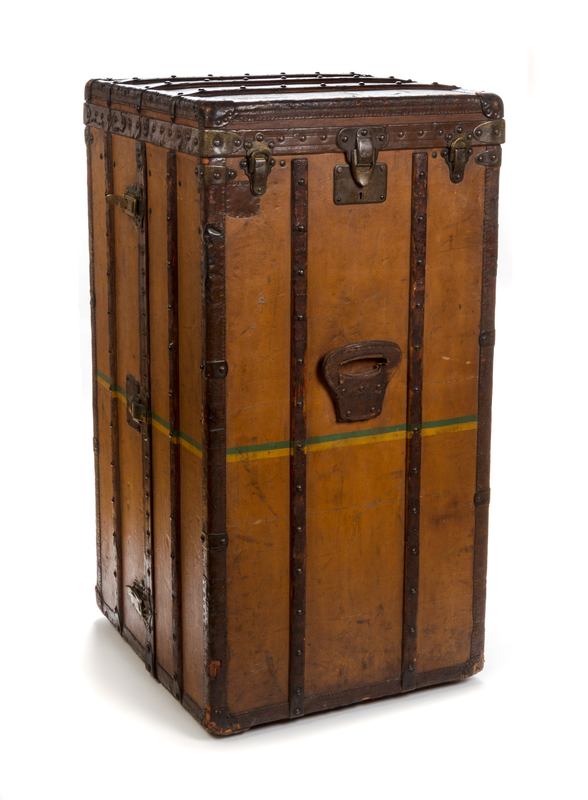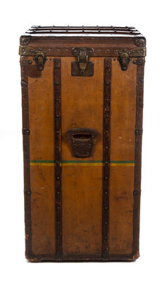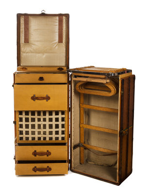 circa 1915,having a hinged top and side which open to reveal a built in cupboard, four fitted drawers, a basket and thirteen hangers. Owner monogram W. Mc C. B. Chicago for William McCormick Blair. Retailed by Marshall Field & Company. Stamped: Louis Vuitton.
