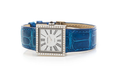 the stainless steel bezel contains numerous round brilliant cut diamonds, 22.00 x 22.00 case dimensions, black Roman numerals, silver baton hands, case back affixed by four screws, quartz movement, original blue alligator strap with deployant buckle.Engraved: CHANEL PARIS ACIER ETANCHE 30m QUARTZ SWISS MADE Y.D. 01756 CHANEL 1989.