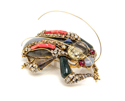 An Iradj Moini Labradorite, Jasper, Azurmalachite, Blue Chalcedony & Coral Grasshopper Brooch.