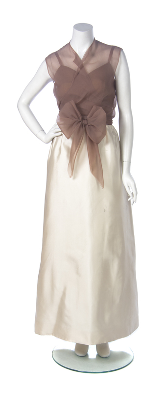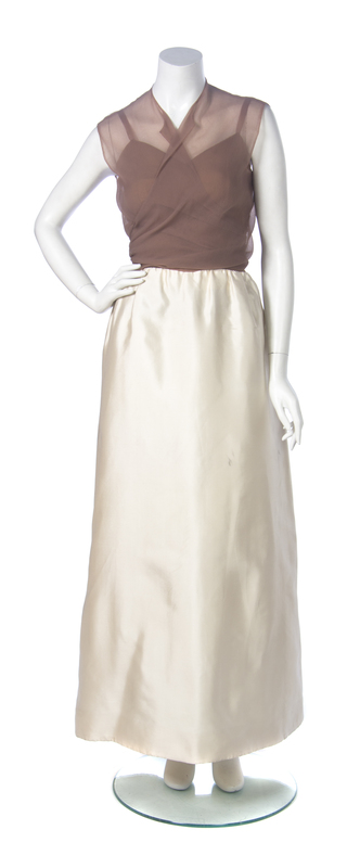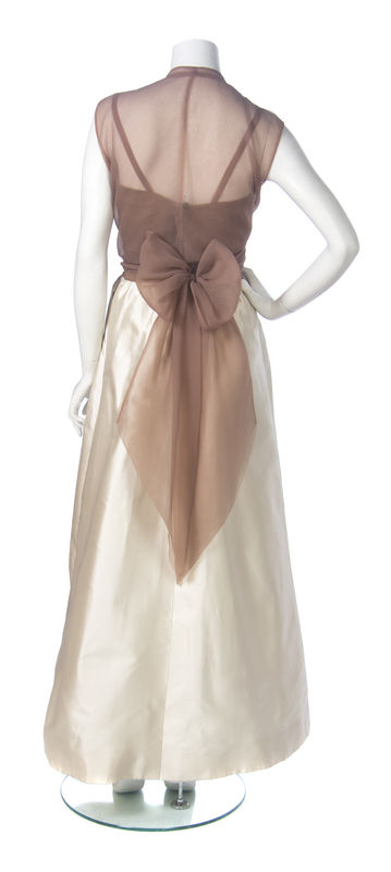 circa 1964,gown with a taupe camisole bodice and a full ivory silk skirt, together with a sleeveless wrap taupe bolero. Labeled: Balenciaga / Tape label: 88885.