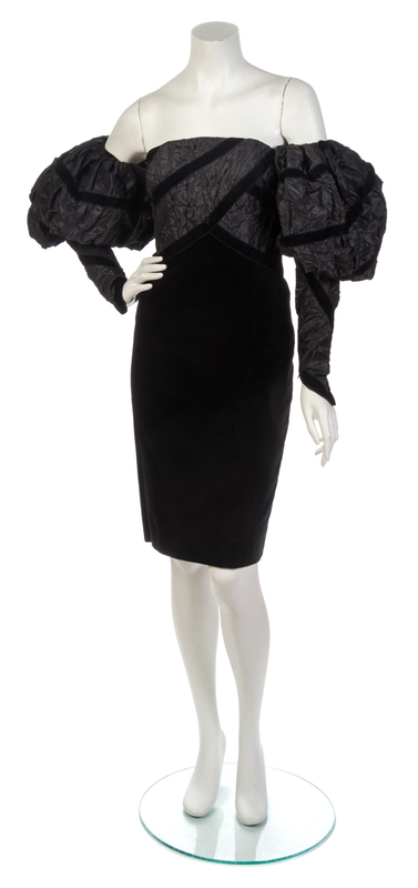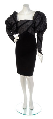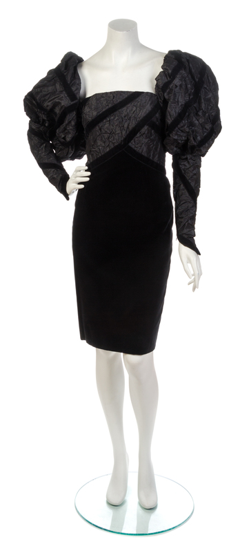 1980s,black crinkle taffeta bodice is piped with asymmetric strips of black velvet fabric, high waist skirt is in a solid black velvet, goldtone Chanel 'perfume' buttons down the center back; together with matching detachable leg-of-mutton sleeves. Labeled: Chanel Boutique.