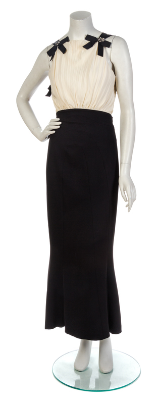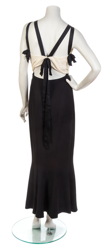 bodice in a pleated ivory silk with black silvertone beaded clover charms attached to the black ribbon shoulder straps, a cut-out back with three black ribbon bows, and a lightly trained hem skirt. Labeled: Chanel.