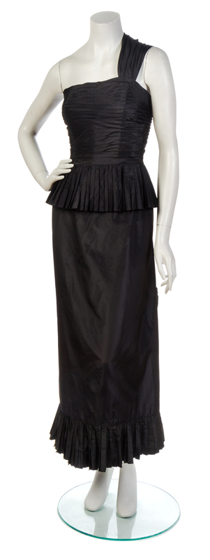 shoulder strap extends asymmetrically across the back and is finished with a self bow, horizontal pleated bodice leads to a vertically pleated peplum waist, center back slit to the skirt is finished with a self bow and a pleated hemline. Labeled: Chanel Boutique.