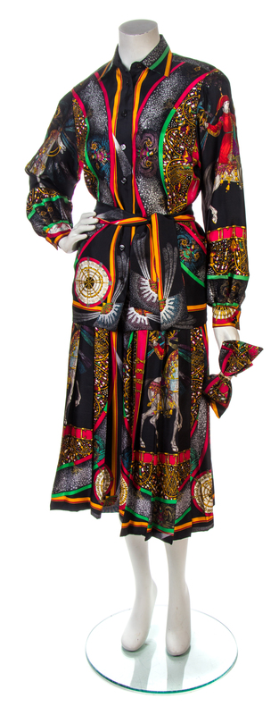 circa 1987, print commemorating Hermes' 150 Year Anniversary. Comprised of a button down shirt with a matching scarf, together with a knife pleated skirt, a matching hair bow barrett and an Hermes 150 Year Anniversary booklet. Each labeled: Hermes.