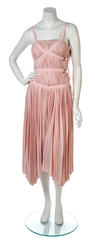 Fall/Winter 2002,sleeveless, with pink grosgrain ribbon belt straps to the bodice. Labeled: Prada.
