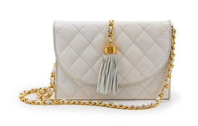 circa 1987,with a leather and chain link tassel, drop-in interwoven leather and chain link shoulder strap, leather trim, interior zippered pocket. Stamped: Chanel.