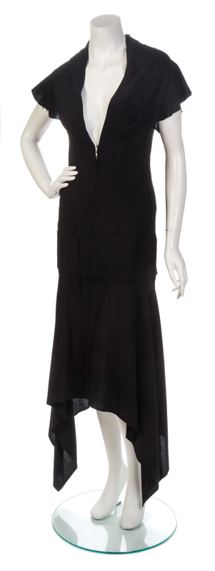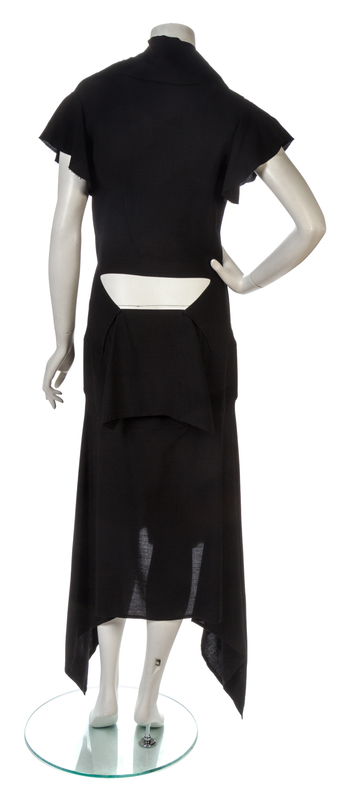 Spring/Summer 2005,Look #30,low V-neckline with short flutter sleeves, geometric cut-outs at the back waistline with a split handkerchief hemline. Labeled: Yohji Yamamoto.