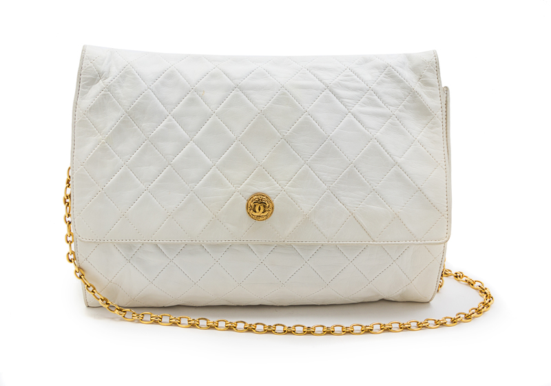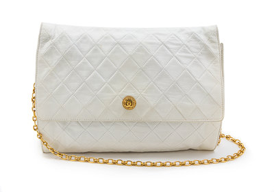with an interlocking 'C' button closure, goldtone hardware, chain link shoulder strap, with one interior zippered pocket and two interior slip pockets, leather lining. Stamped: Chanel.