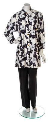 with goldtone Chanel logo buttons and two flap pockets, together with a pair of black silk pants. Each labeled: Chanel.