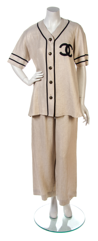 comprised of a raglan sleeve top with black and goldtone Chanel logo buttons, a black piped trim and a black interlocking 'C' logo to upper right corner; together with a pair of elastic waist wide leg pants. Each labeled: Chanel.
