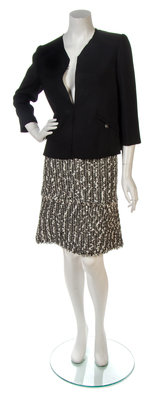 comprised of a black wool open front jacket with an unfinished trim hem two slant pockets and a gunmetal chain-weighted hem, together with a black and silver boucle tweed skirt. Each labeled: Chanel.