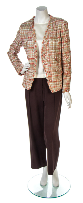 edged in a fringe trim with domed sunburst resin buttons, four slant welt pockets and a silvertone chain-weighted hem; together with an ivory silk camisole and a pair of brown silk pleated pants. Each labeled: Chanel.