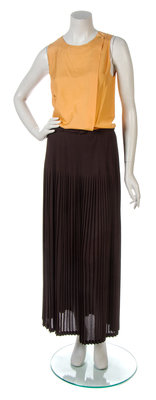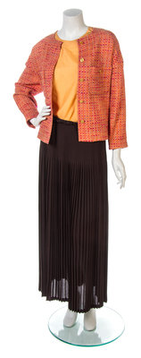 with goldtone buttons and two patch pockets, together with a marigold silk shell and a brown jersey knife pleated skirt. Each labeled: Chanel.