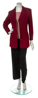 single breasted with gunmetal Chanel logo buttons, two patch pockets, two vetical welt pockets and a gunmetal chain-weighted hem; together with a rouge and ivory silk print camisole and a pair of black wool pleated waist pants. Each labeled: Chanel.