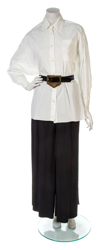 comprised of white cotton oversized button down shirt with a Chanel logo embroidered patch pocket, together with a pair of black wide leg side-split hem pants, and a black leather and goldtone buckle belt. Each labeled: Chanel.