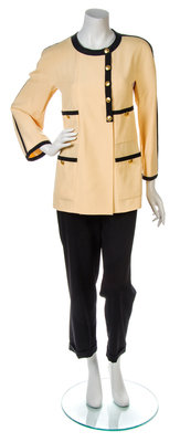 with a black grosgrain ribbon trim, four patch pockets and goldtone Chanel logo buttons, together with a pair of black wool cuffed hem pants. Each labeled: Chanel.