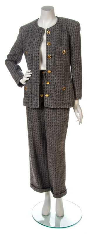 comprised of a collarless jacket with four patch pockets and goldtone perfume bottle buttons, an ivory silk short sleeve shirt and a pair of matching grey wool tweed cuffed trousers. Labeled: Chanel.