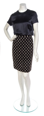 comprised of a single breasted jacket with faux pearl buttons and four, patch pockets and a goldtone chain weighted hem; together with a black short sleeve silk top and a matching fitted skirt. Each labeled: Chanel.