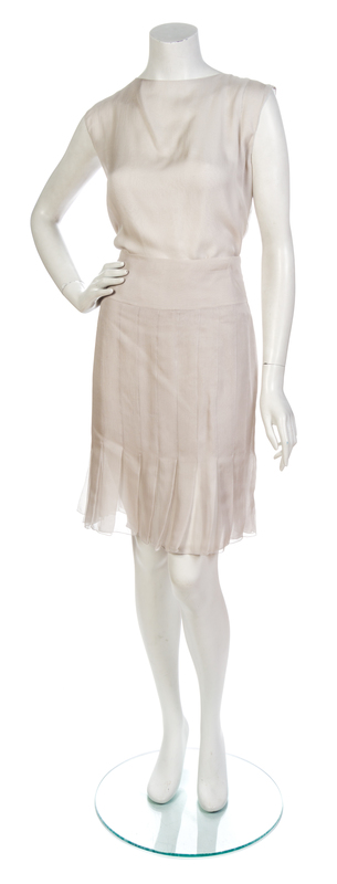 comprised of a boxy jacket edged in fringe with two goldtone Chanel buttons, two patch pockets and a goldtone chain weighted hem, together with a taupe silk chiffon camisole and a taupe silk chiffon pleated skirt. Each labeled: Chanel.