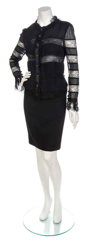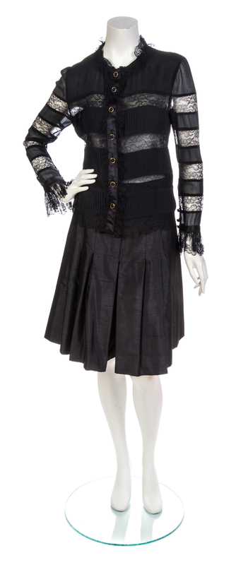 comprised of a black lace and pleated chiffon button down blouse, together with a pair of black shantung pleated skorts and a black fitted skirt with button down split back hem. Each labeled: Chanel.