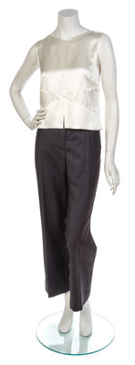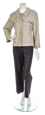 comprised of a taupe boucle boxy jacket, with a hidden button-down placket, two flap patch pockets and a silvertone chain-weighted hem, together with an ivory silk V-neck shell and a pair of grey wool flat front pants. Each labeled: Chanel.