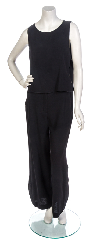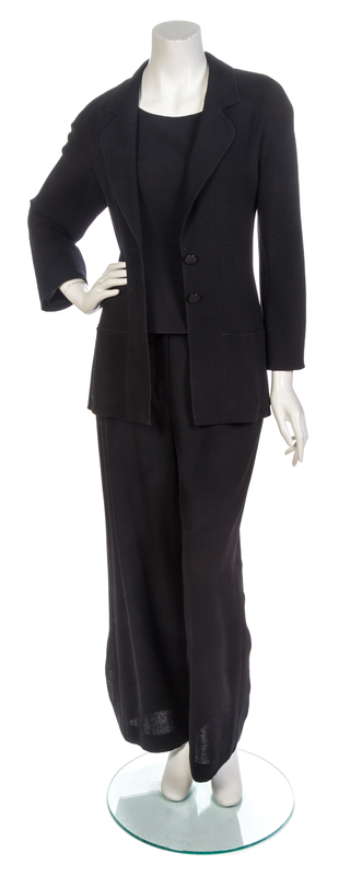 comprise of a single breasted cardigan jacket with two patch pockets and a black chain weighted hem, together with a matching shell and a pair of matching flat front waist trousers. Each labeled: Chanel.