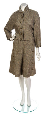 comprised of a boxy jacket with goldtone domed buttons, together with a pair of matching culottes with button down center splits to each leg. Each labeled: Chloe.