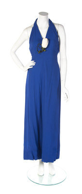 with a deep V-neck front with a single ivory silk rosette applique to the bust, an interior boned bodice and an oversized ribbon bow to the nape of the neck. Labeled: Christian Dior for Saks Fifth Avenue.