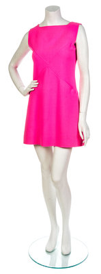 comprised of a sleeveless A-line dress with two slanted slash pockets, together with a boxy cropped button down jacket. Each labeled: Courreges Paris.