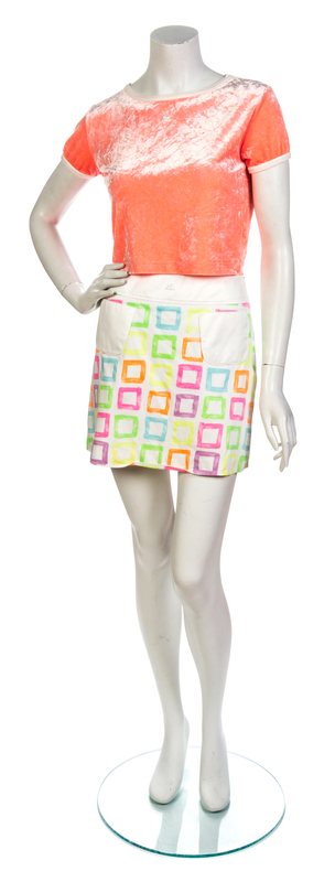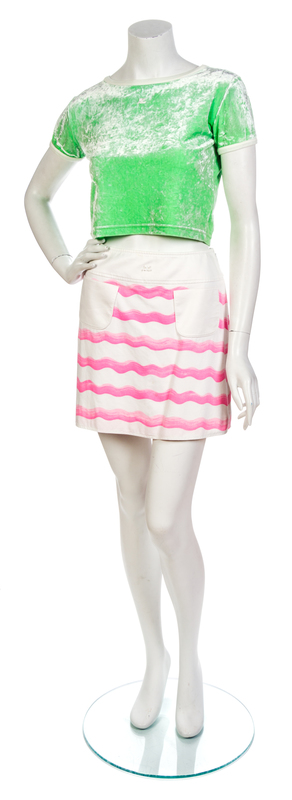 comprised of two cotton and neon printed mini skirts and two neon color velour cropped tops. Each labeled: Courreges Paris.