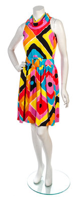 sleeveless with a rolled stand collar and slip pockets, together with a matching buckle belt. Labeled: Donald Brooks.
