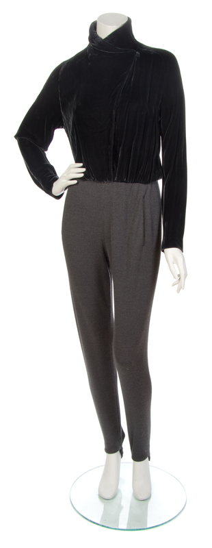 1990s,velvet bodice with two snap button closures and a single self covered button closure at the neckline, with attached grey stirrup pants. Labeled: Donna Karan New York.