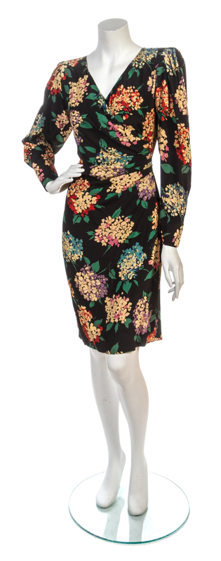full length sleeves with a gathered surplice neckline. Labeled: Ungaro.
