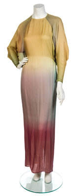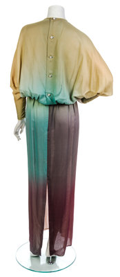 rounded neckline with dolman zippered sleeves, rhinestone button down back with a cinched back waist and a center split hemline. Labeled: Galanos.