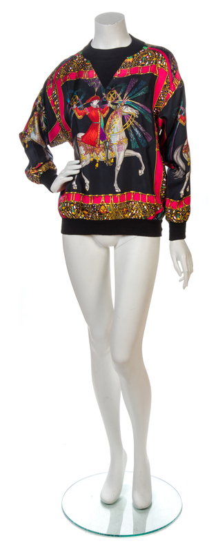 circa 1987, print commemorating Hermes' 150 Year Anniversary.Comprised of a cashmere and silk crewneck pullover, and a cashmere and silk button down cardigan. Each labeled: Hermes.