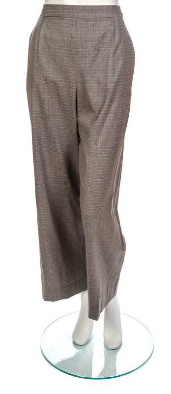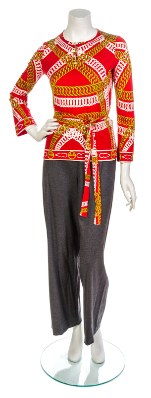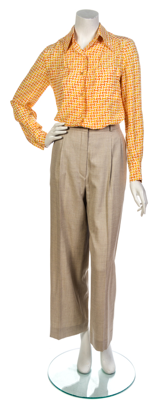 comprised of an orange H pint silk button down blouse, a red gold and white chain link print silk top and neck tie; together with three pairs of grey wool pants. Each labeled: Hermes.
