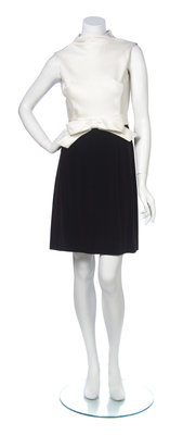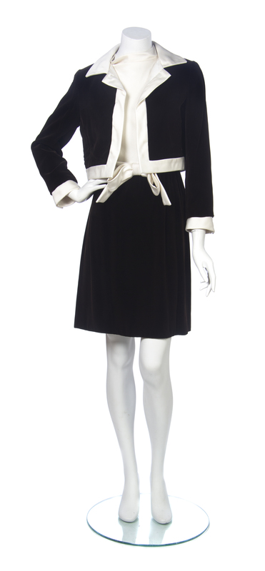 comprised of a sleeveless mock neck dress, top in an ivory bodice with an attached decorative bow to the waist, bottom skirt in a brown velvet; together with a boxy brown velvet and ivory trim jacket. Labeled: Maisonette.