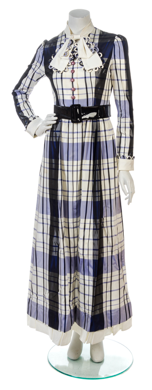 full length sleeves, oversized bow to the neck, two inseam pockets and a white pleated hem, together with a black patent leather belt. Labeled: Malcom Starr / Designed by Rizkallah.