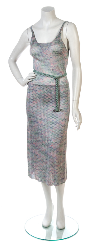comprised of a sleeveless V-neck slip dress, together with a short open front cardigan and a matching rope belt. Each labeled: Missoni.