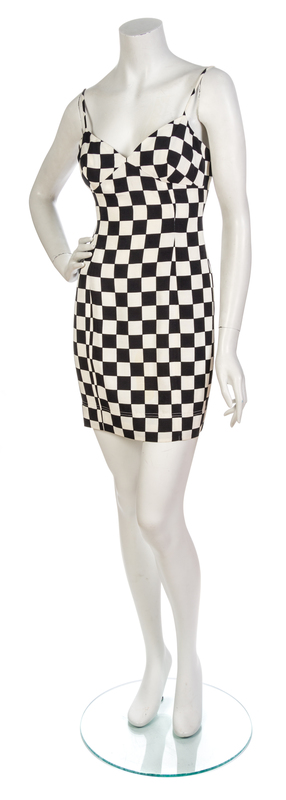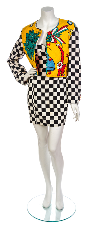 1989,quilted jacket with Popeye cartoon throughout, together with a fitted black and white check slip dress. Labeled: Moschino Pret-a-Porter.