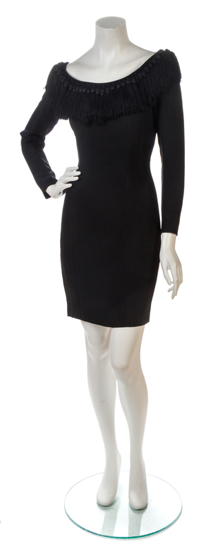 form fitting with a black silk tassel fringe neckline. Labeled: Moshino Couture!
