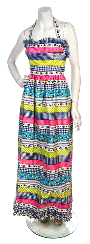 1970s,halter straps to the ruffle trim neckline, with two inseam pockets and ruffle trim hem. Labeled: Oscar de la Renta Boutique.