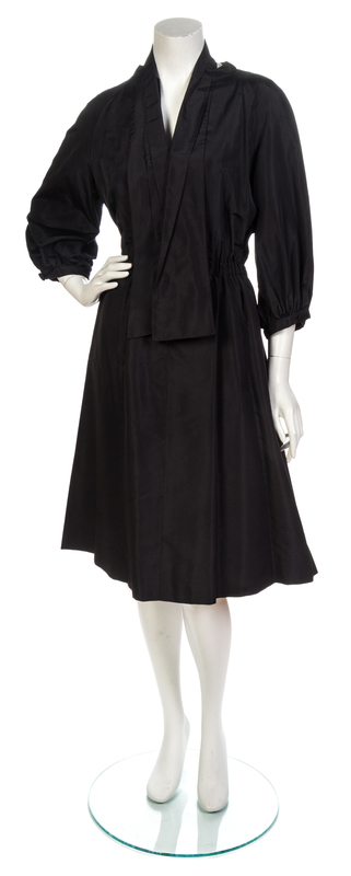 notched neckline, quarter length blouson sleeve, hidden snap button closure, together with a pleated sash. Labeled: Pauline Trigere.