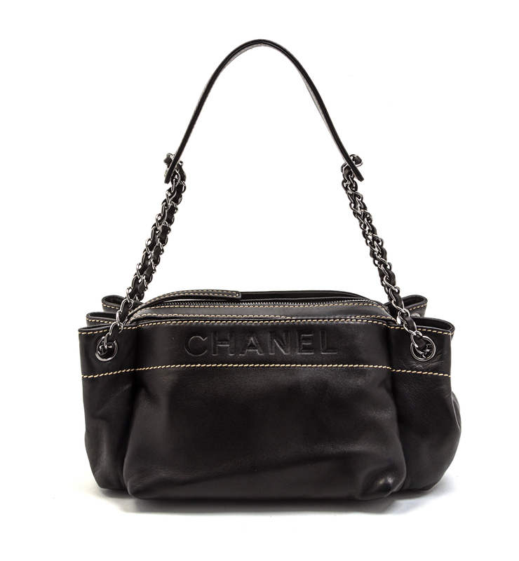 2004, large "Chanel" logo stamp, ivory stitching, silvertone hardware, leather strap with interwoven leather and chain link sides, four exterior slip pockets, zippered top closure, zippered interior pocket. Stamped: Chanel.