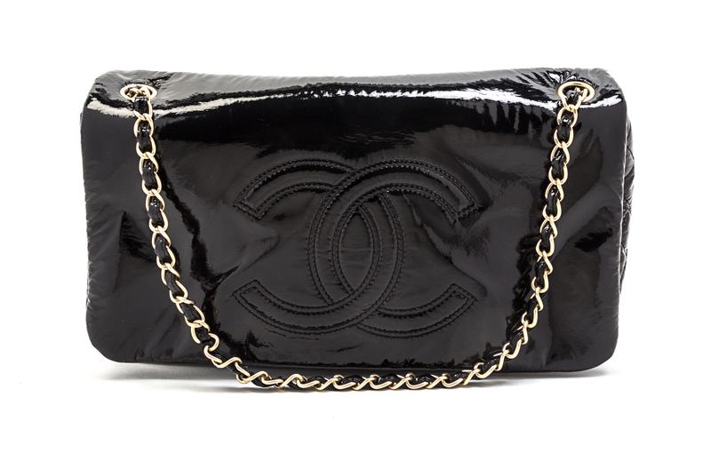 circa 2007, foldover flap with large interlocking 'C' logo, two interwoven leather and chain link straps, quilted sides and bottom, with zippered interior pocket and tan satin lining. Stamped: Chanel.