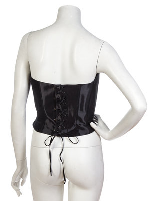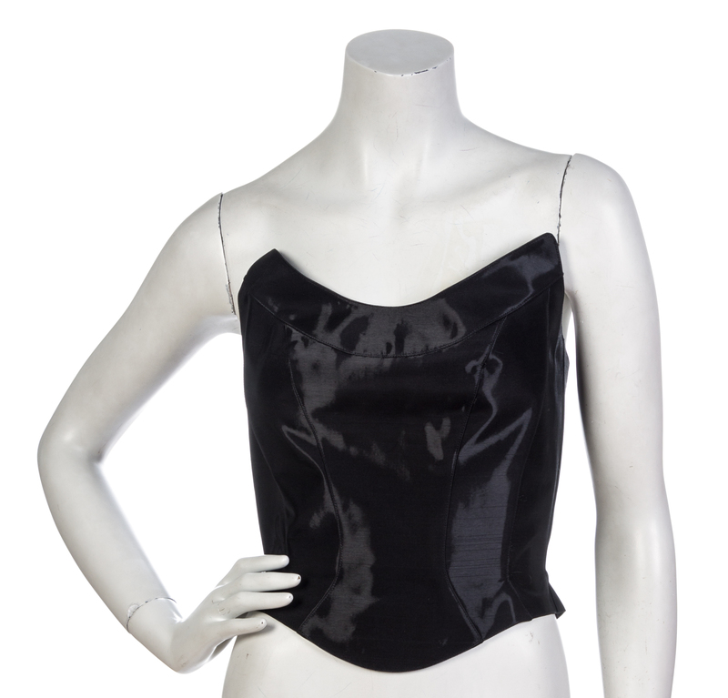 modified peaked neckline with a scalloped hem, corset lacing to the back conceals a hidden snap button placket. Labeled: Thierry Mugler.