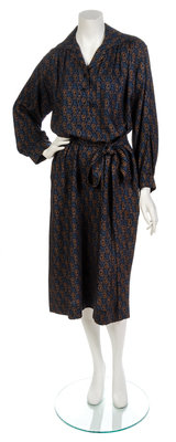 button down neckline, with blouse sleeves and a self belt. Labeled: Saint Laurent Rive Gauche.